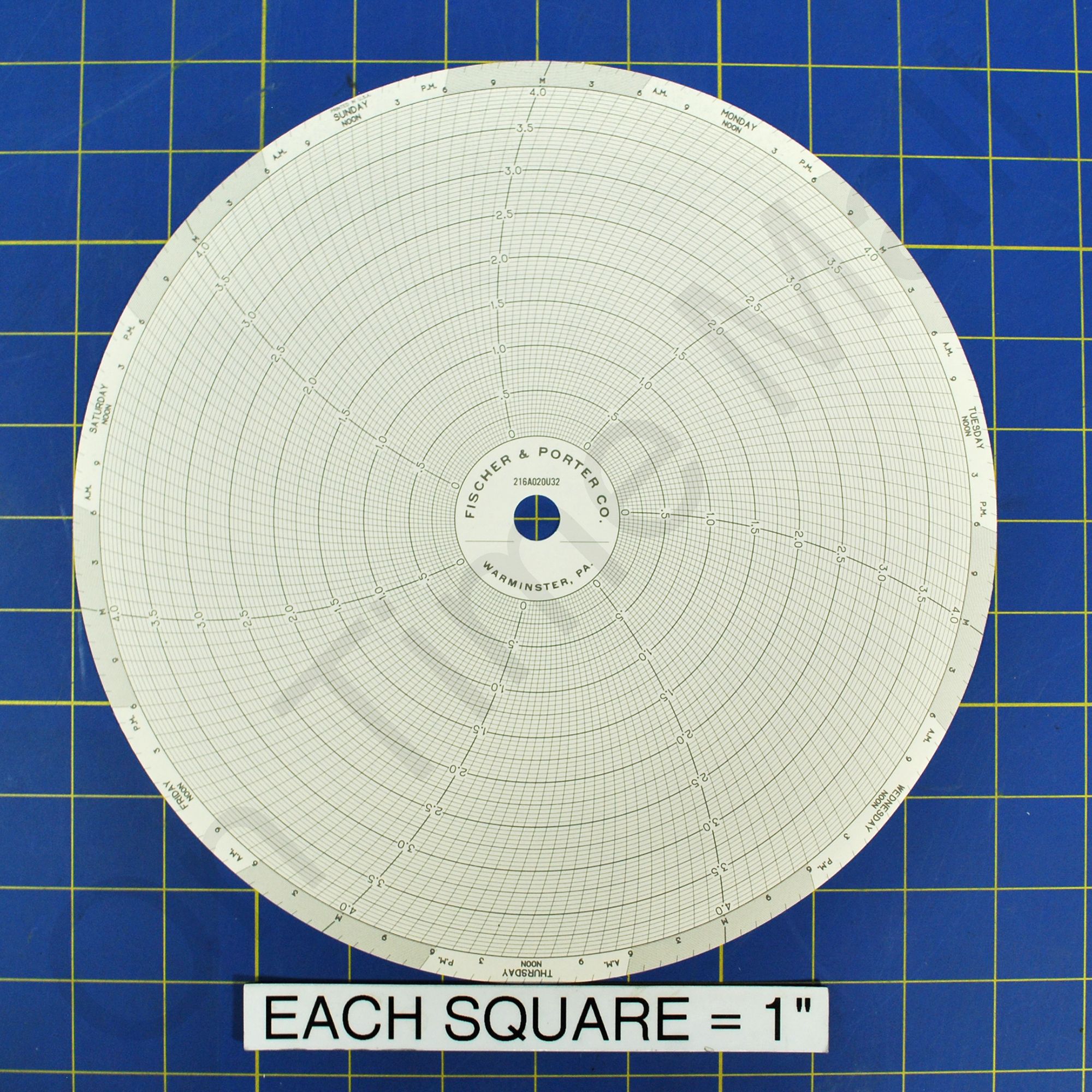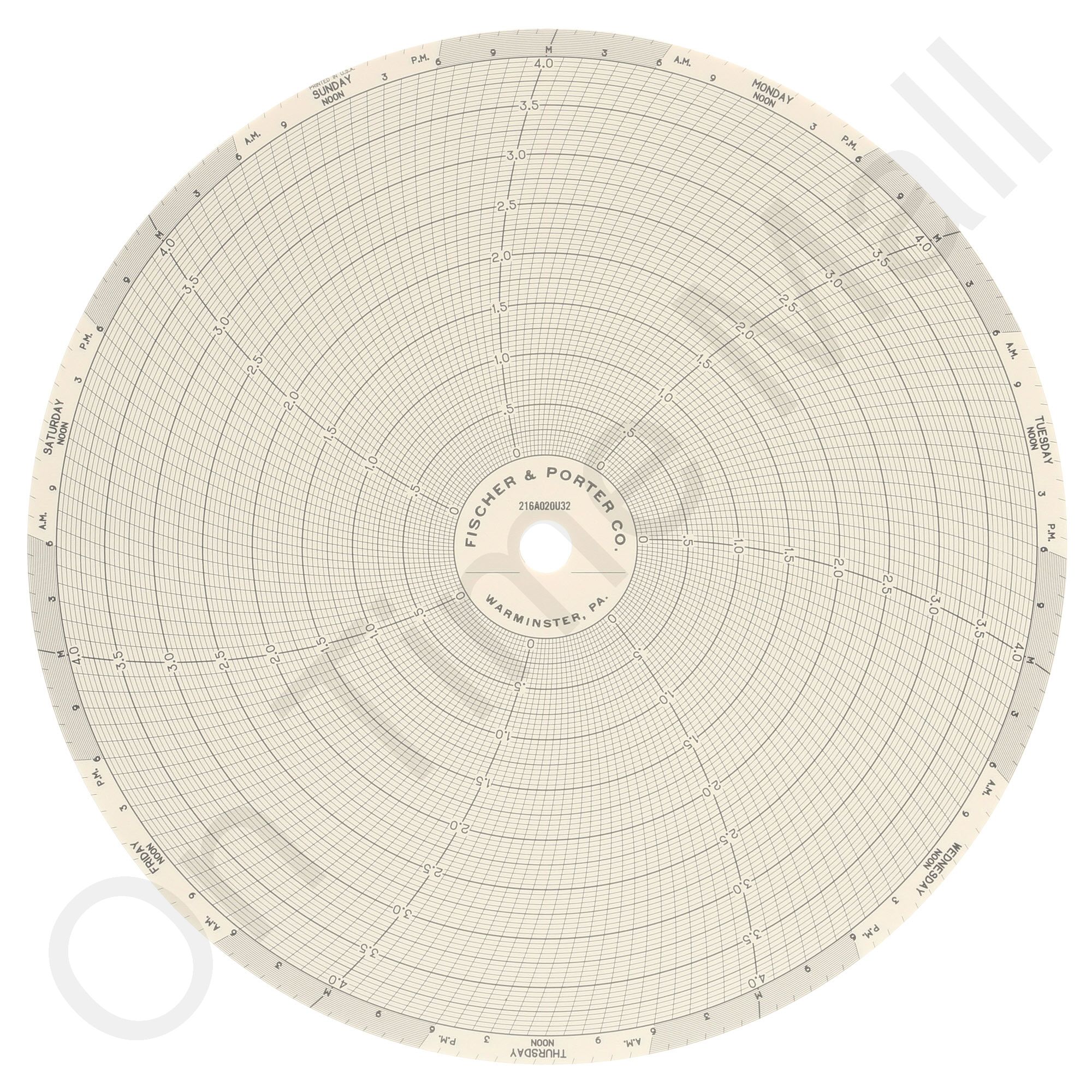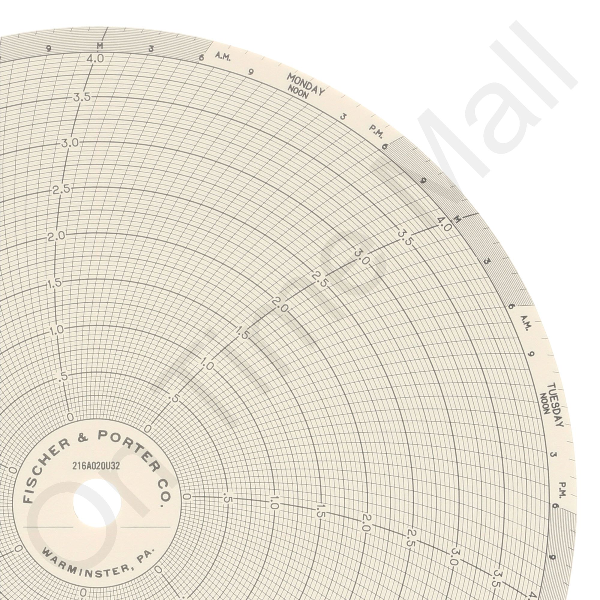 Fischer Porter 216A020U32 Circular Charts. Replacement circular charts for industrial chart recorder. Package contains 100 circular charts. Also known as: 0095011, 31473203.