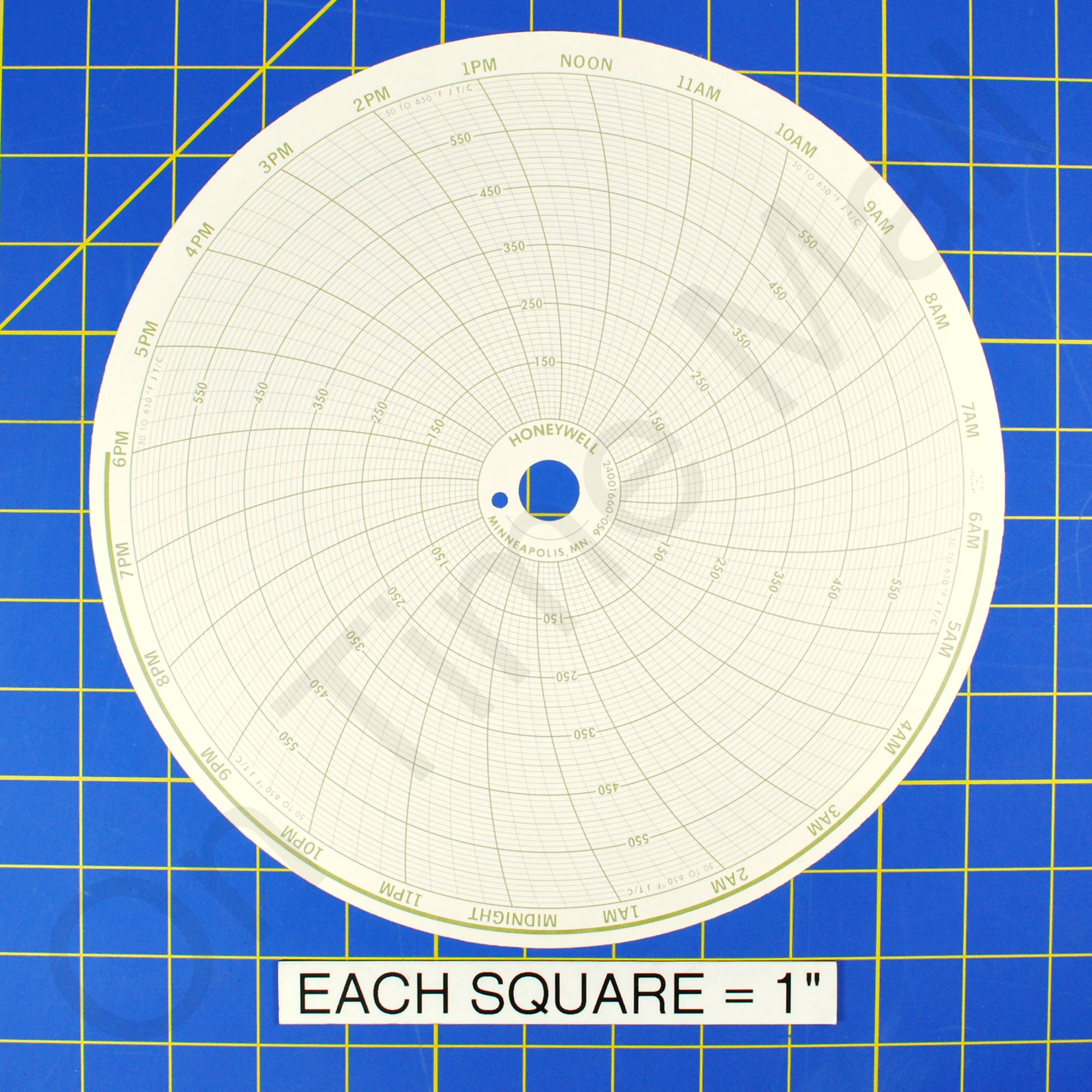Replacement circular charts for Honeywell industrial chart recorder. Package contains 100 circular charts. 50 - 650, 24H, 10 inch.