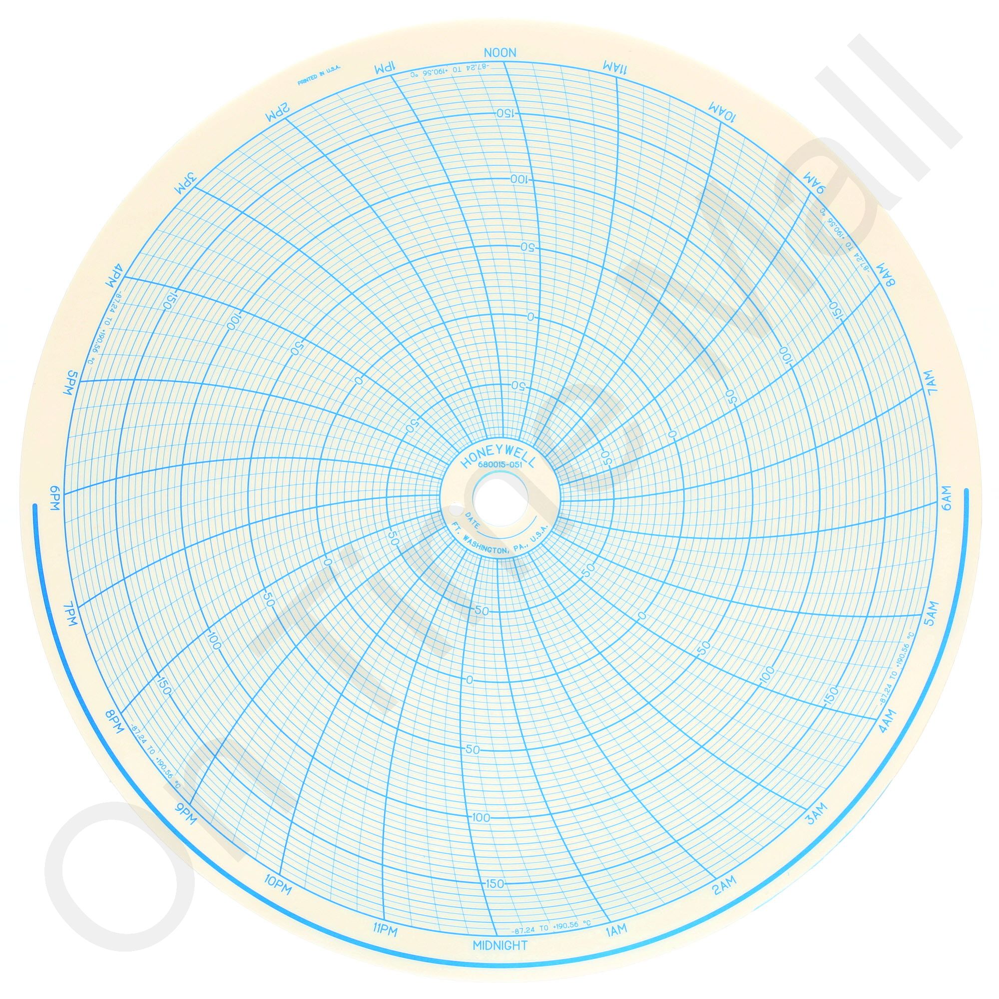 Replacement 12 inch round circular charts for Honeywell industrial chart recorder. Package contains 100 circular charts. Note: This chart is the same as 16484, but the color and timing font size is different.